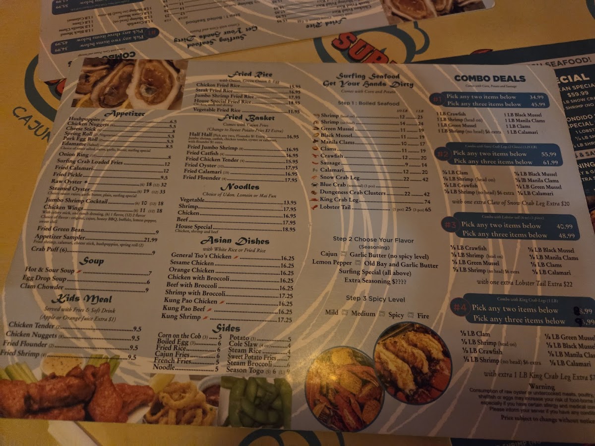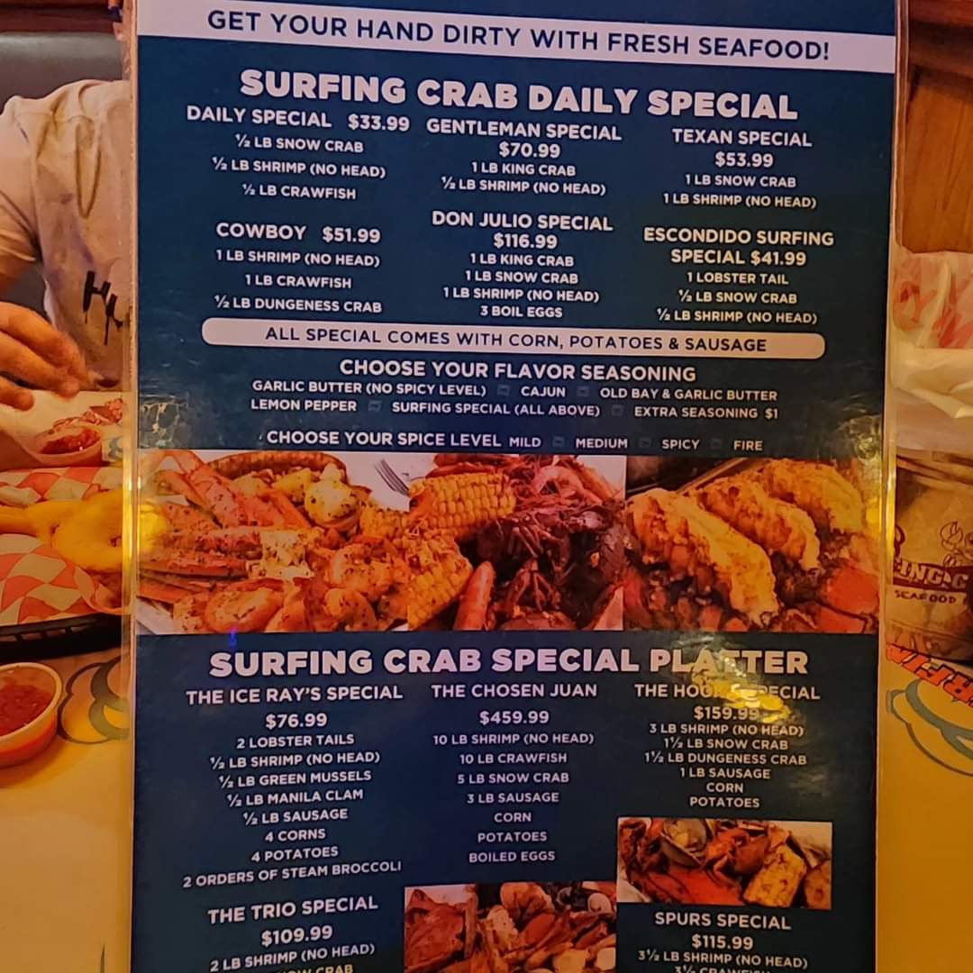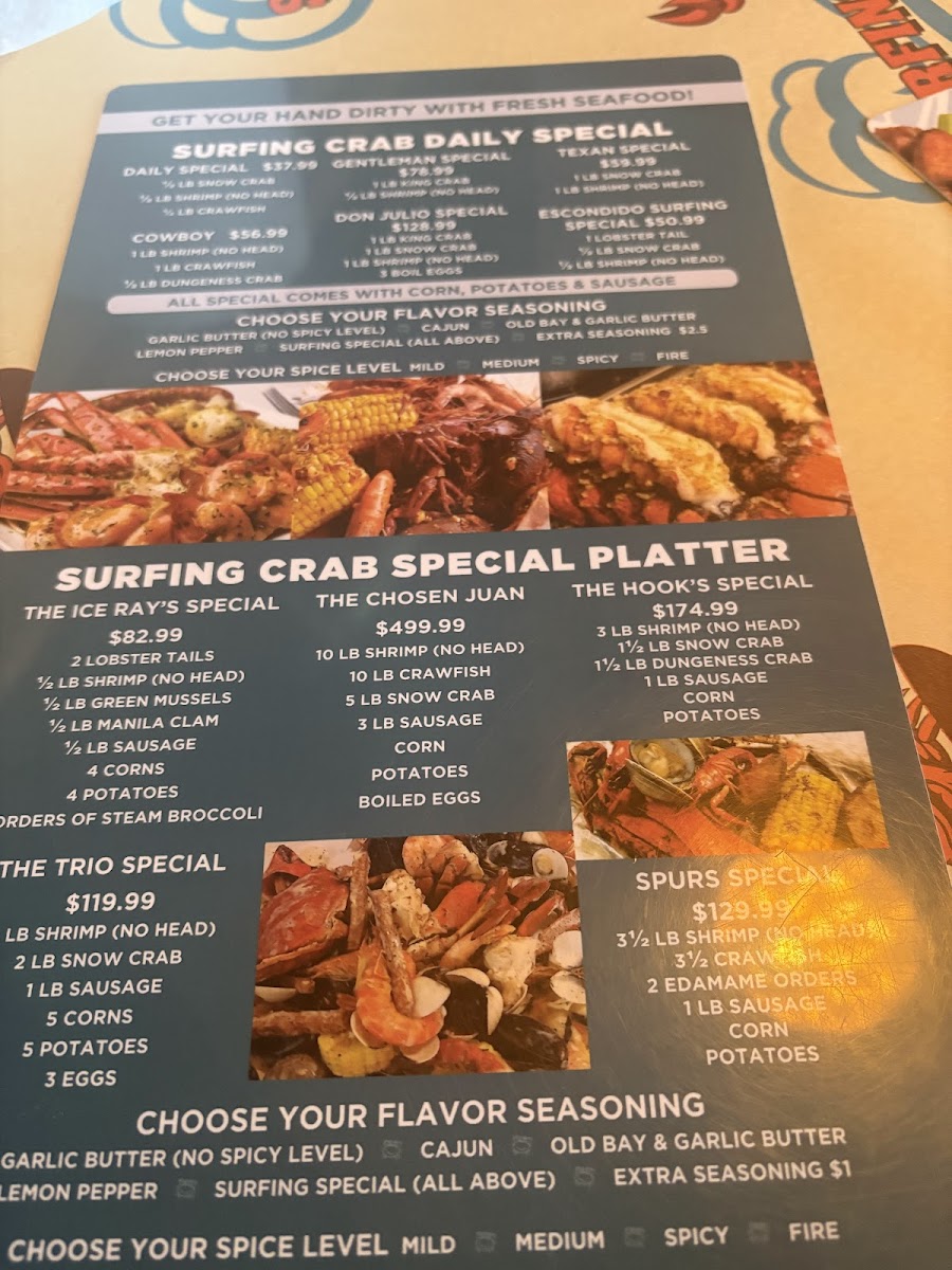 Choose from 1/2 lb or 1 lb servings. Flavors include Cajun, garlic butter, lemon pepper, old bay with garlic, or Surfing Special combining all. Spicy levels from mild to fire.