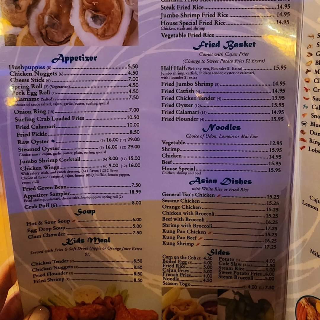Shrimp, served in 1/2 lb or 1 lb options. Choose from Cajun, garlic butter, lemon pepper, old bay and garlic mix, or Surfing special flavors. Spicy levels: mild to fire.